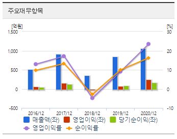 힘스는 2020년 매출액 1062억원으로 전년대비 대략 25% 상승, 영업이익 249억 원으로 전년대비 대략 224% 상승, 당기순이익 168억 원으로 전년대비 대략 100% 상승을 기록했습니다.
