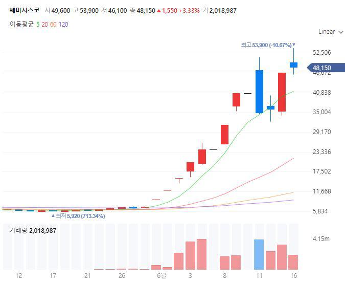 위 사진에서 보시는바와 같이 쎄미시스코의 재무와 실적은 엉망이라고 할 수 있습니다. 하지만 최근 며칠간 주가는 거의 10배 뛰었습니다. 왜 올랐을까요?