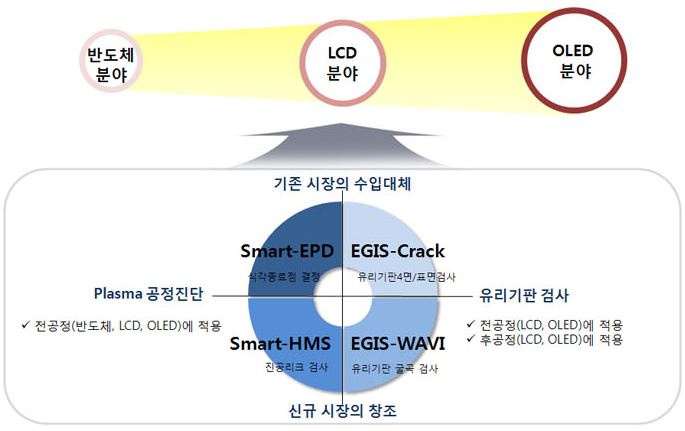 EGIS-Crack은 업계 최초 4면, 표면 복합 검사기로 유리기판의 깨짐과 흠집 및 이물질 여부를 검사하는 제품입니다. 유리기판 대형화에 따라 검사가 필수적으로 증대되고 있으며 공정 중에 전수, 실시간 검사로 생산효율을 증대할 수 있습니다. 이 제품은 LCD의 유리기판, OLED용 유리기판 검사에 적용됩니다. 주요 매출처는 삼성전자, LG디스플레이, 중국의 BOE, 일본의 NEG 등이 있습니다.
