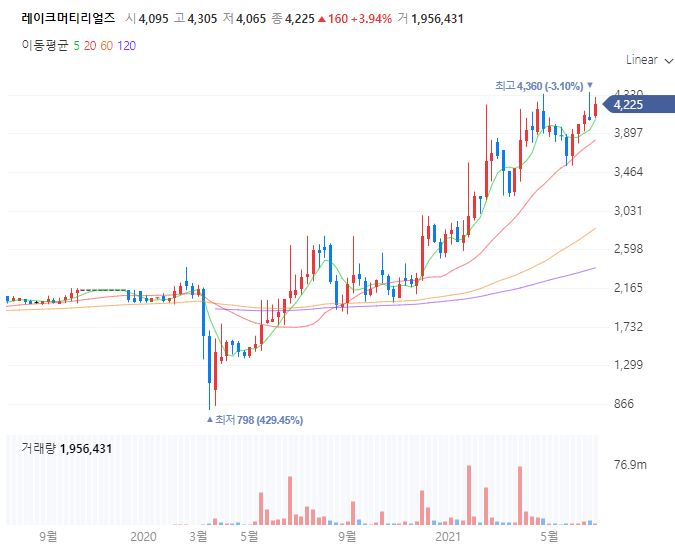 레이크머티리얼즈의 주가는 2020년 3월 코로나19로 인해 폭락한 이후 계속적인 상승세를 보이고 있습니다. 현재 시가총액 2,777억 원, 코스닥 372위입니다.