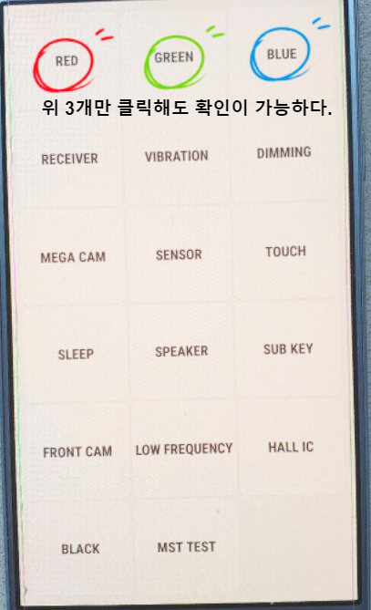 잔상을 확인하는 방법은 매우 간단하다. 휴대폰 전화 키패드로 가서 [*#0*#] 혹은 [*#7353]을 입력하면 된다.